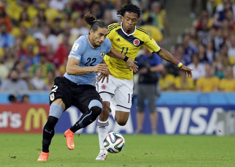 Uruguajčan Martin Caceres v súboji s kolumbijským futbalistom Juanom Cuadradom počas sobotňajšieho osemfinálového zápasu na svetovom šampionáte v Brazílii. Foto: SITA/AP