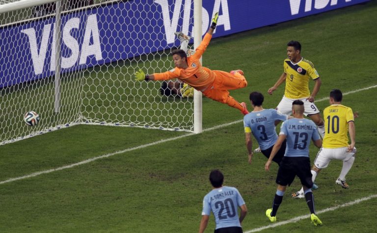 Kolumbijský útočník James Rodriguez prekonáva kolumbijského brankára Fernanda Musleru počas sobotňajšieho osemfinálového zápasu na svetovom šampionáte v Brazílii. Foto: SITA/AP