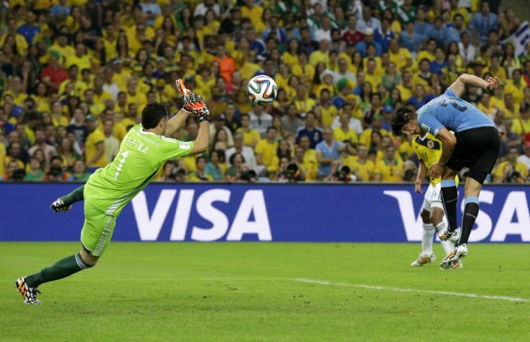Uruguajčan Edinson Cavani sa snaží prekonať kolumbijského brankára Davida Ospinu počas sobotňajšieho osemfinálového zápasu na svetovom šampionáte v Brazílii. Foto: SITA/AP