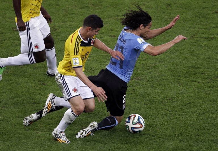 Uruguajčan Edinson Cavani v súboji s kolumbijským futbalistom Jamesom Rodriguezom počas sobotňajšieho osemfinálového zápasu na svetovom šampionáte v Brazílii. Foto: SITA/AP