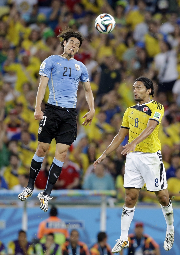 Uruguajčan Edinson Cavani v súboji s kolumbijským futbalistom Abelom Aguilarom počas sobotňajšieho osemfinálového zápasu na svetovom šampionáte v Brazílii. Foto: SITA/AP