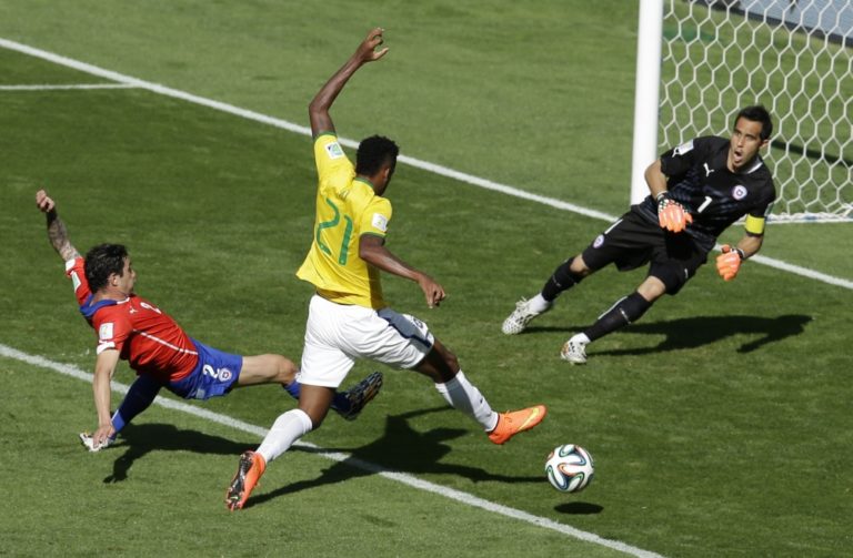 Hráč Brazílie Jo (vľavo) a brankár Čile Claudio Bravo počas zápasu osemfinále na majstrovstvách sveta vo futbale v Brazílii. Foto: SITA/AP