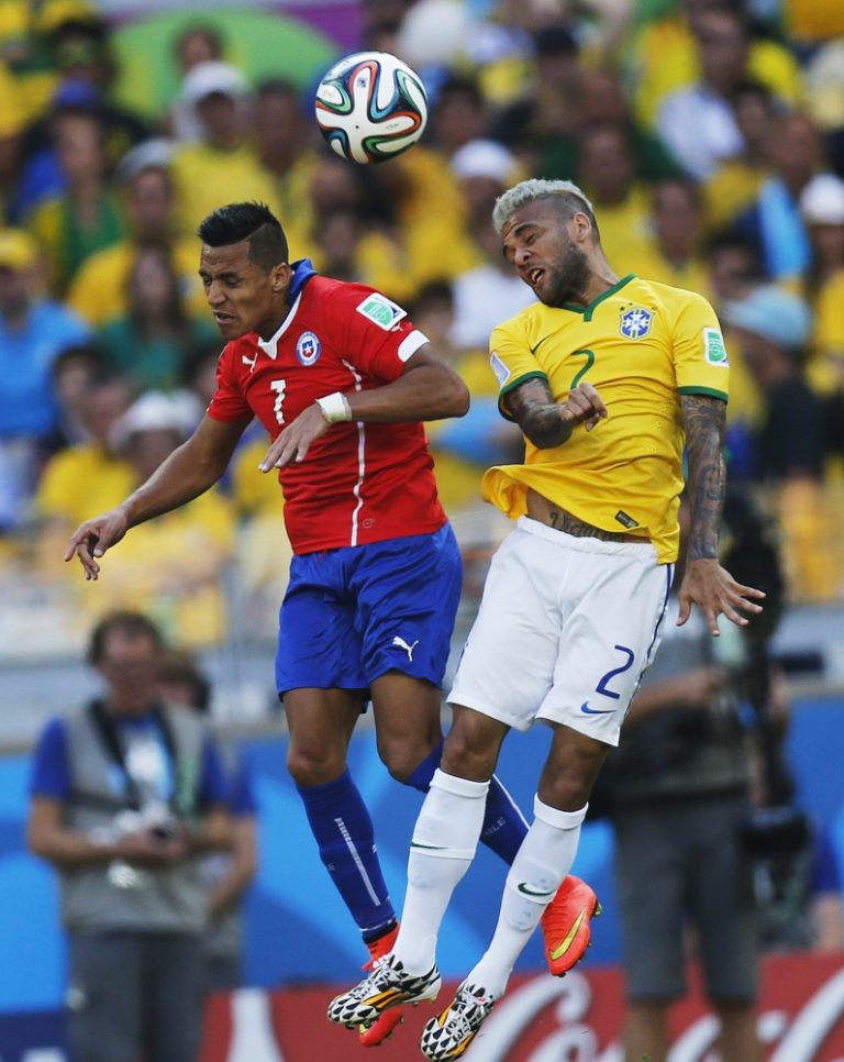 Brazílsky futbalista Dani Alves v súboji s Čiľanom Alexisom Sanchezom počas sobotňajšieho osemfinálového zápasu na majstrovstvách sveta. Foto: SITA/AP