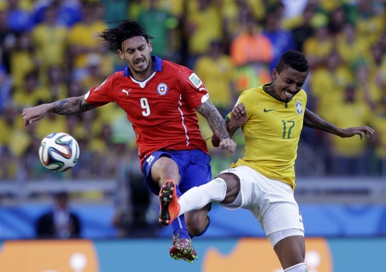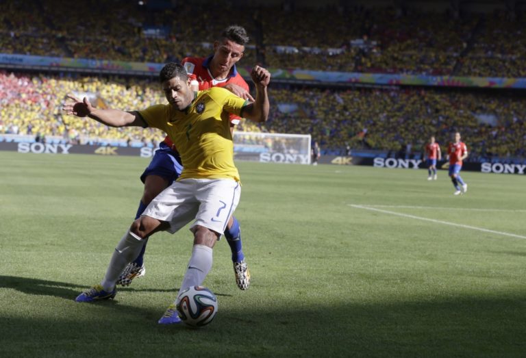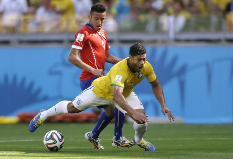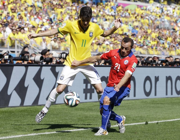 Brazílsky futbalista Ramires v súboji s Čiľanom Felipem Gutierrezom počas sobotňajšieho osemfinálového zápasu na majstrovstvách sveta. Foto: SITA/AP