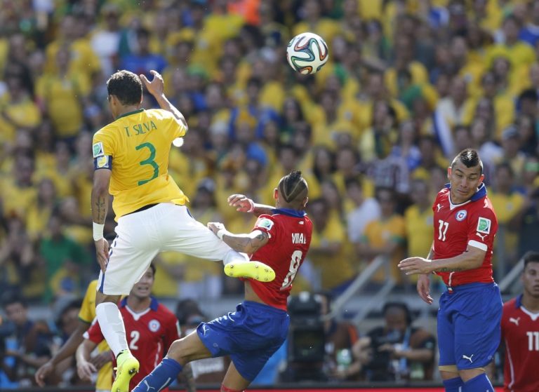 Čiľan Arturo Vidal v hlavičkovom súboji s brazílskym futbalistom Thiagom Silvom počas sobotňajšieho osemfinálového zápasu na majstrovstvách sveta. Foto: SITA/AP