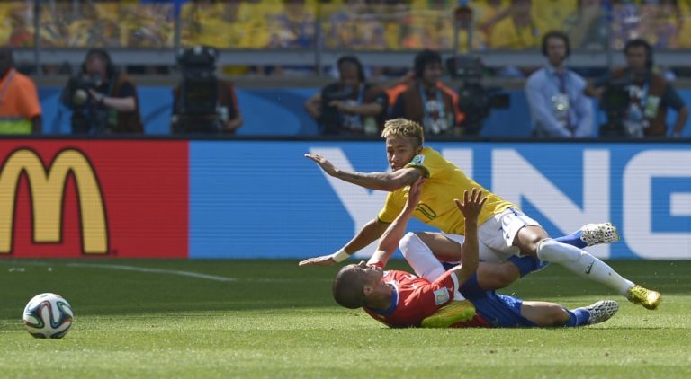 Brazílčan Neymar padá po zákroku čilského futbalistu Francisca Silvu počas sobotňajšieho osemfinálového zápasu na majstrovstvách sveta. Foto: SITA/AP