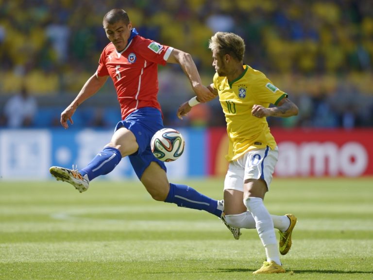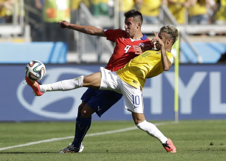 Čiľan Francisco Silva v súboji s brazílskym futbalistom Neymarom počas sobotňajšieho osemfinálového zápasu na majstrovstvách sveta. Foto: SITA/AP