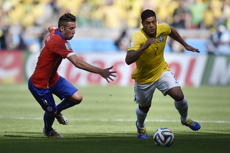 Brazílsky útočník Hulk v súboji s čilským futbalistom Mauriciom Islom počas sobotňajšieho osemfinálového zápasu na majstrovstvách sveta. Foto: SITA/AP