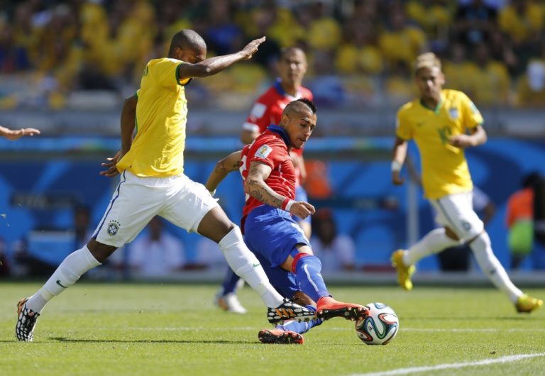 Gary Medel (vľavo) a hráč Brazílie Fred počas zápasu osemfinále na majstrovstvách sveta vo futbale v Brazílii. Foto: SITA/AP