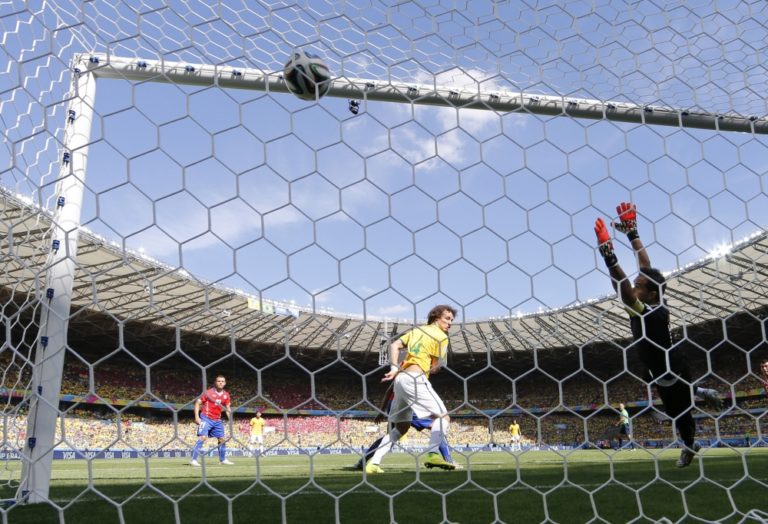 Lopta po zakončení Brazílčana Davida Luiza končí za v sieti čilského brankára Claudia Brava počas sobotňajšieho osemfinálového zápasu na majstrovstvách sveta. Foto: SITA/AP