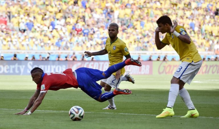 Čiľan Arturo Vidal padá po súboji s brazílskym futbalistom Thiagom Silvom počas sobotňajšieho osemfinálového zápasu na majstrovstvách sveta. Foto: SITA/AP