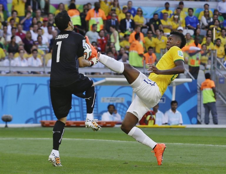 Hráč Brazílie Jo a brankár Čile Claudio Bravo počas zápasu osemfinále na majstrovstvách sveta vo futbale v Brazílii. Foto: SITA/AP