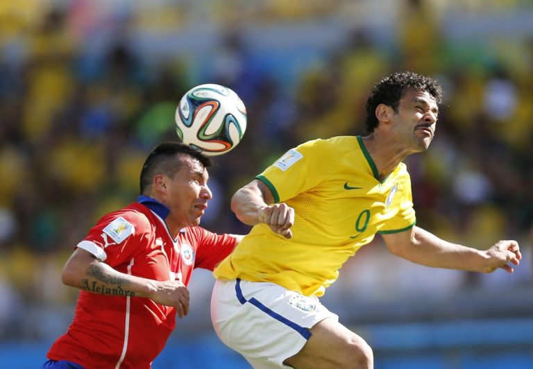 Brazílsky futbalista Fred v súboji Čiľanom Garym Medelom počas sobotňajšieho osemfinálového zápasu na majstrovstvách sveta. Foto: SITA/AP