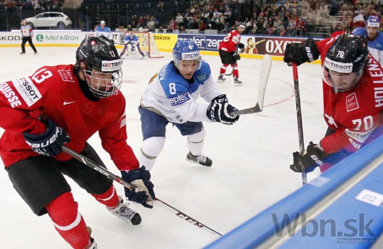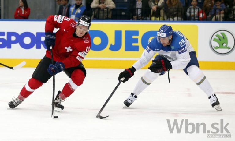 Švajčiarsky útočník Denis Hollenstein (vpravo) a jeho spoluhráč Kevin Fiala v súboji s kazašským útočníkom Talgatom Žailauovom počas sobotňajšieho zápasu na MS v hokeji. Foto: SITA/AP
