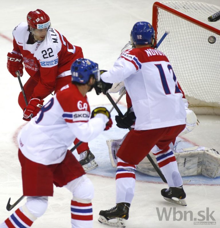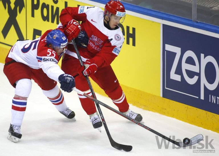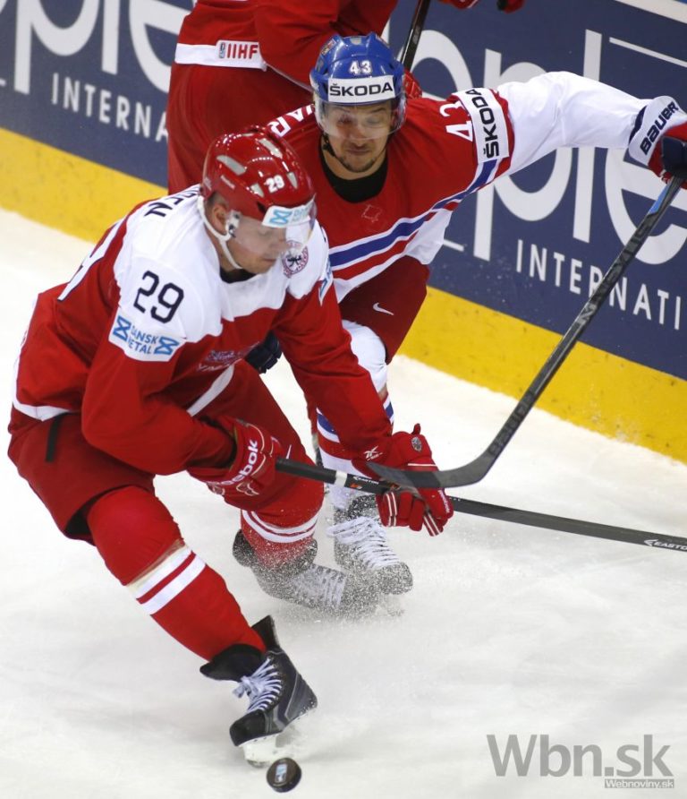 Český útočník Jan Kovář v súboji s Dánom Mortenom Madsenom počas sobotňajšieho zápasu na MS v hokeji. Foto: SITA/AP