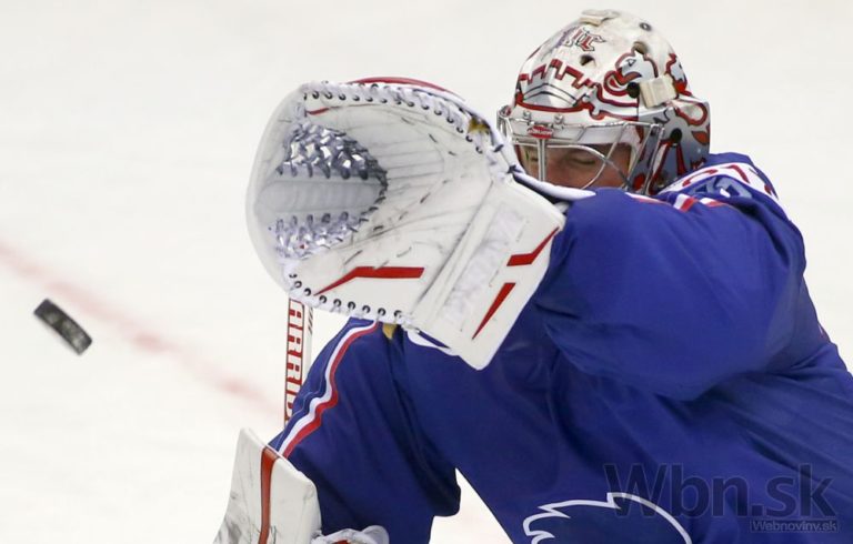 Francúzsky brankár Cristobal Huet chytá do lapačky puk po strele jedného z nórskych hokejistov počas sobotňajšieho zápasu na MS v hokeji. Foto: SITA/AP