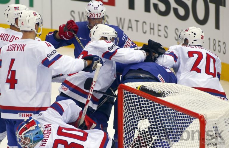 Súboj nórskych a francúzskych hokejistov pred brankárom Larsom Haugenom počas sobotňajšieho zápasu na MS v hokeji. Foto: SITA/AP