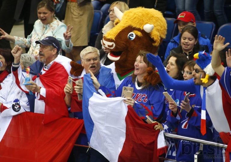 Francúzsky fanúšikovia počas sobotňajšieho zápasu na MS v hokeji, v ktorom reprezentácia 'galského kohúta' porazila po nájazdoch Nórsko. Foto: SITA/AP