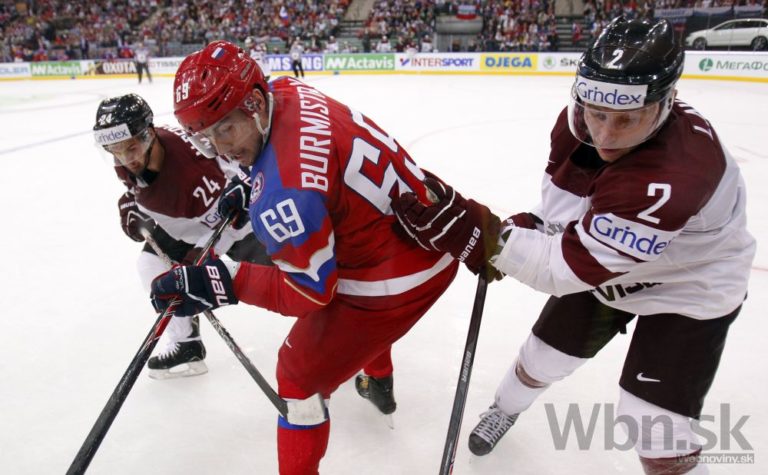 Ruský útočník Alexander Burmistrov v súboji s Lotyšmi Mikelisom Redlihsom a Rodrigom Lavinšom počas sobotňajšieho zápasu na MS v hokeji. Foto: SITA/AP