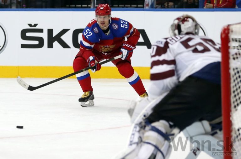 Ruský útočník Arťom Anisimov strieľa na lotyšskú bránku počas sobotňajšieho zápasu na MS v hokeji. Foto: SITA/AP
