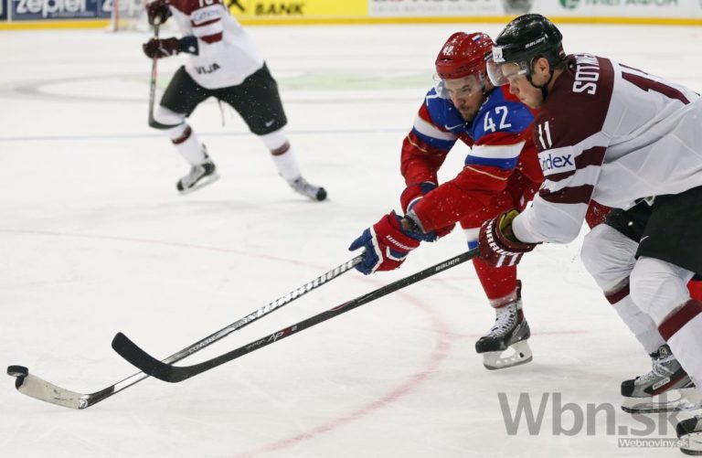 Ruský útočník Jevgenij Dadonov v súboji s Lotyšom Herbertsom Vasiljevsom počas sobotňajšieho zápasu na MS v hokeji. Foto: SITA/AP