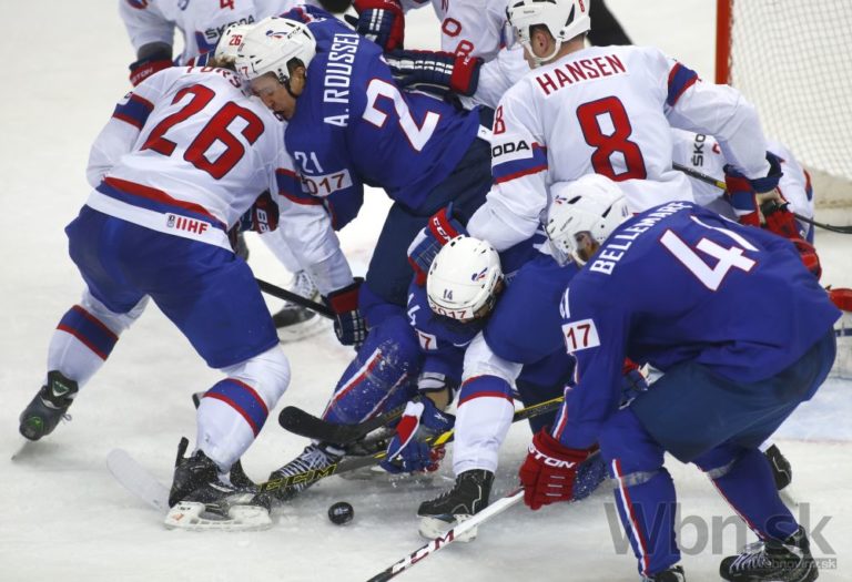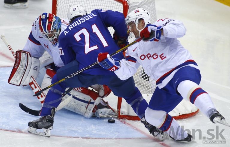 Nór Mats Trygg v súboji s francúzskym útočníkom Antoineom Rousselom pred brankárom Larsom Haugenom počas sobotňajšieho zápasu na MS v hokeji. Foto: SITA/AP
