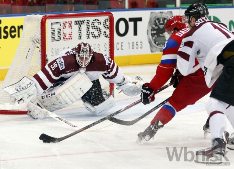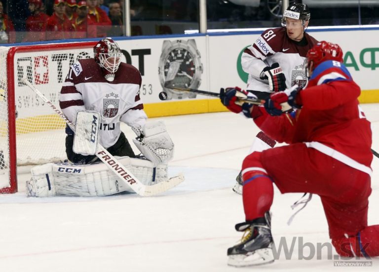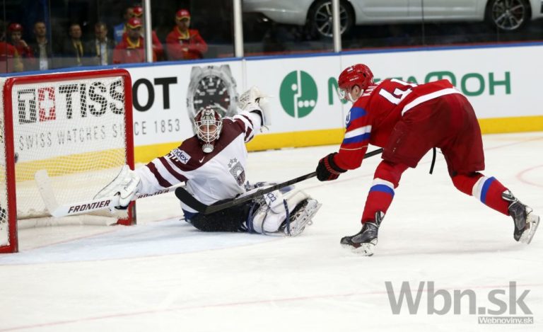 Ruský útočník Sergej Kalinin prekonáva lotyšského brankára Kristersa Gudlevskisa počas sobotňajšieho zápasu na MS v hokeji. Foto: SITA/AP