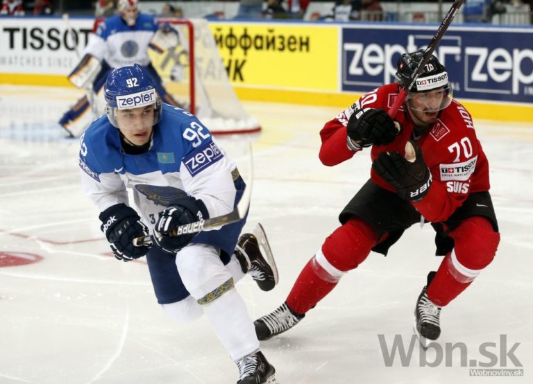 Švajčiarsky útočník Denis Hollenstein v súboji s Kazachom Michaiľom Rachmanovom počas sobotňajšieho zápasu na MS v hokeji. Foto: SITA/AP