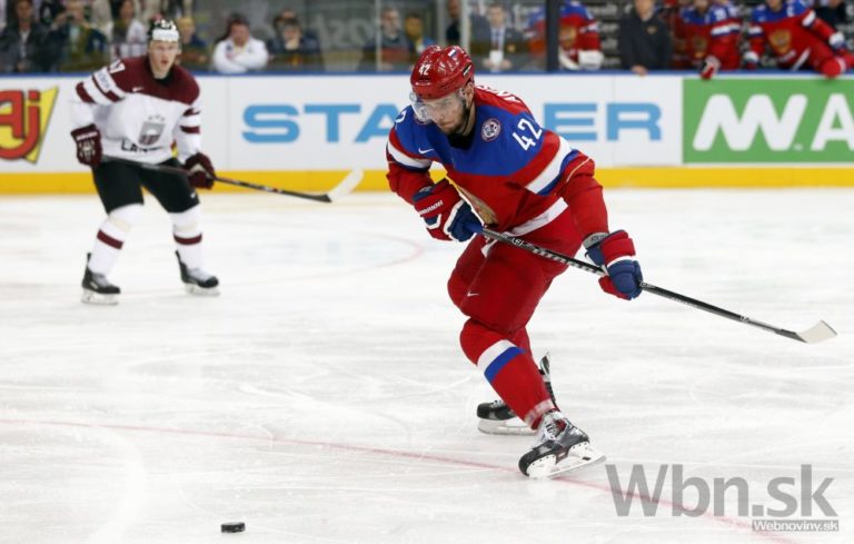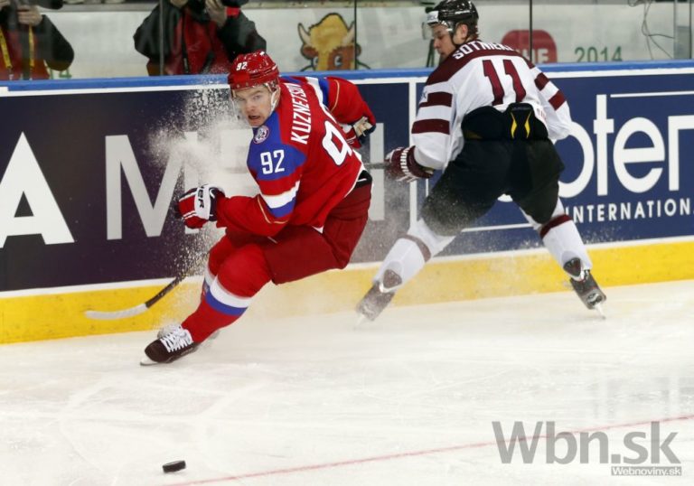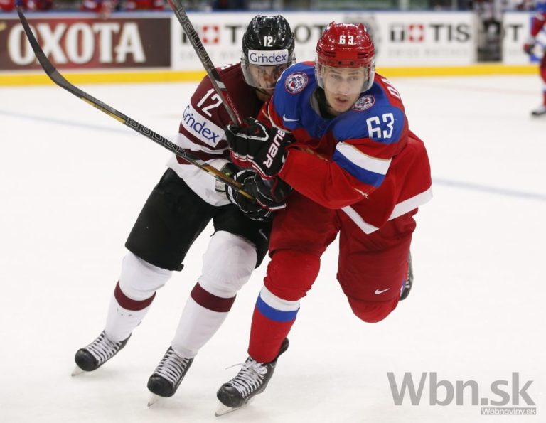 Ruský útočník Jevgenij Kuznecov v súboji s lotyšským obrancom Kristapsom Sotnieksom počas sobotňajšieho zápasu na MS v hokeji. Foto: SITA/AP