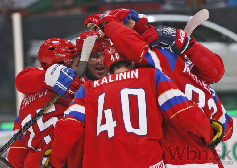 Radosť ruských hokejistov po góle v sieti Lotyšska počas sobotňajšieho zápasu na MS v hokeji. Foto: SITA/AP