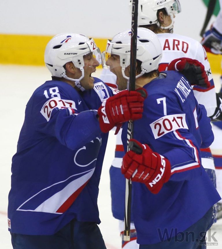 Zľava: Francúzi Yorick Treille a Yohann Auvitu sa radujú z gólu v sieti Nórska počas sobotňajšieho zápasu na MS v hokeji. Foto: SITA/AP