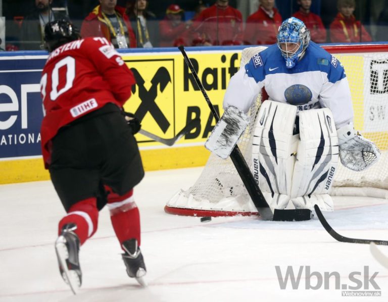 Švajčiar Denis Hollenstein strieľa na brankára Kazachstanu Vitalija Jeremejeva počas sobotňajšieho zápasu na MS v hokeji. Foto: SITA/AP