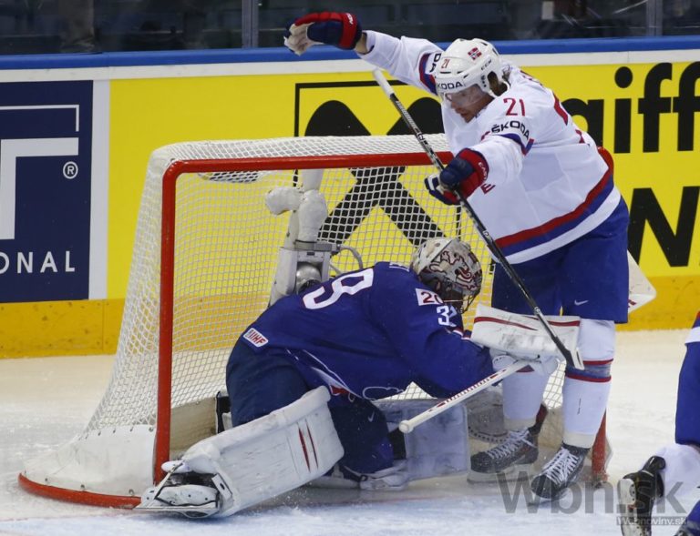 Puk po strele Jaromíra Jágra končí za chrbtom dánkeho brankára počas sobotňajšieho zápasu na MS v hokeji. Foto: SITA/AP