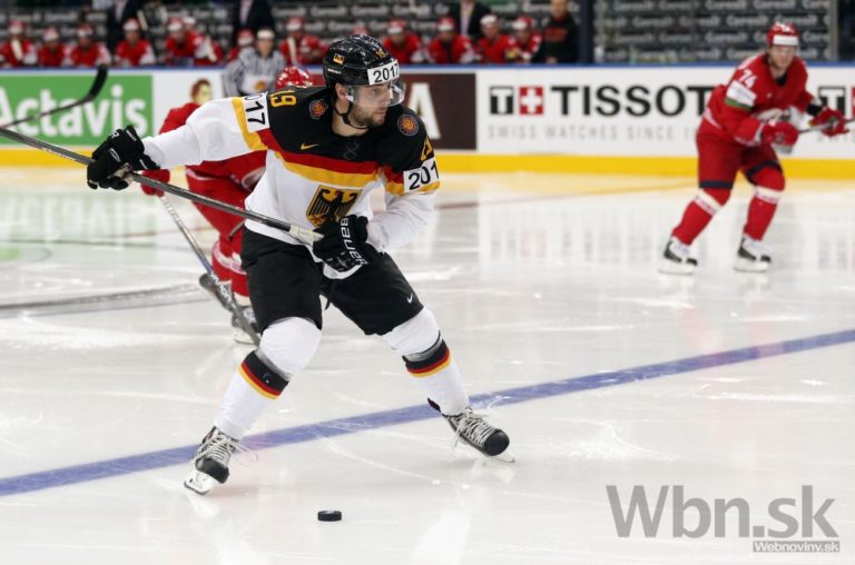 Nemecký útočník Thomas Oppenheimer strieľa na bránku Bieloruska počas sobotňajšieho zápasu na MS v hokeji. Foto: SITA/AP