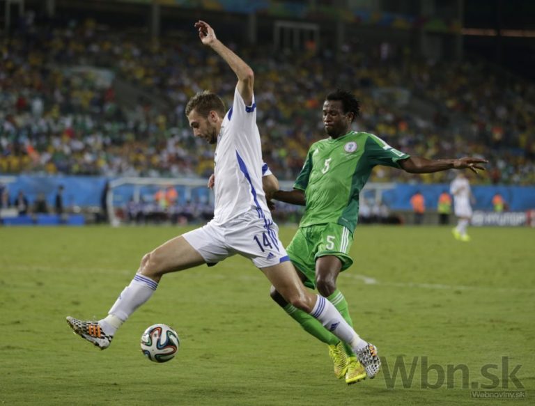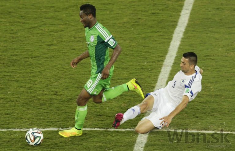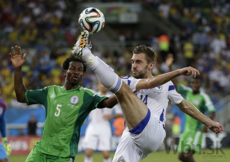 Futbalista Bosny a Hercegoviny Vedad Ibisevisa snaží zastaviť Nigérijčana Johna Obi Mikela počas sobotňajšieho zápasu F-skupiny na svetovom šampionáte v Brazílii. Foto: SITA/AP