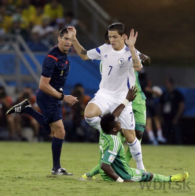 Rozhodca Peter O'Leary sleduje súboj futbalistami Bosny a Hercegoviny Muhameda Besica s Nigérijčanmi počas sobotňajšieho zápasu F-skupiny na svetovom šampionáte v Brazílii. Foto: SITA/AP