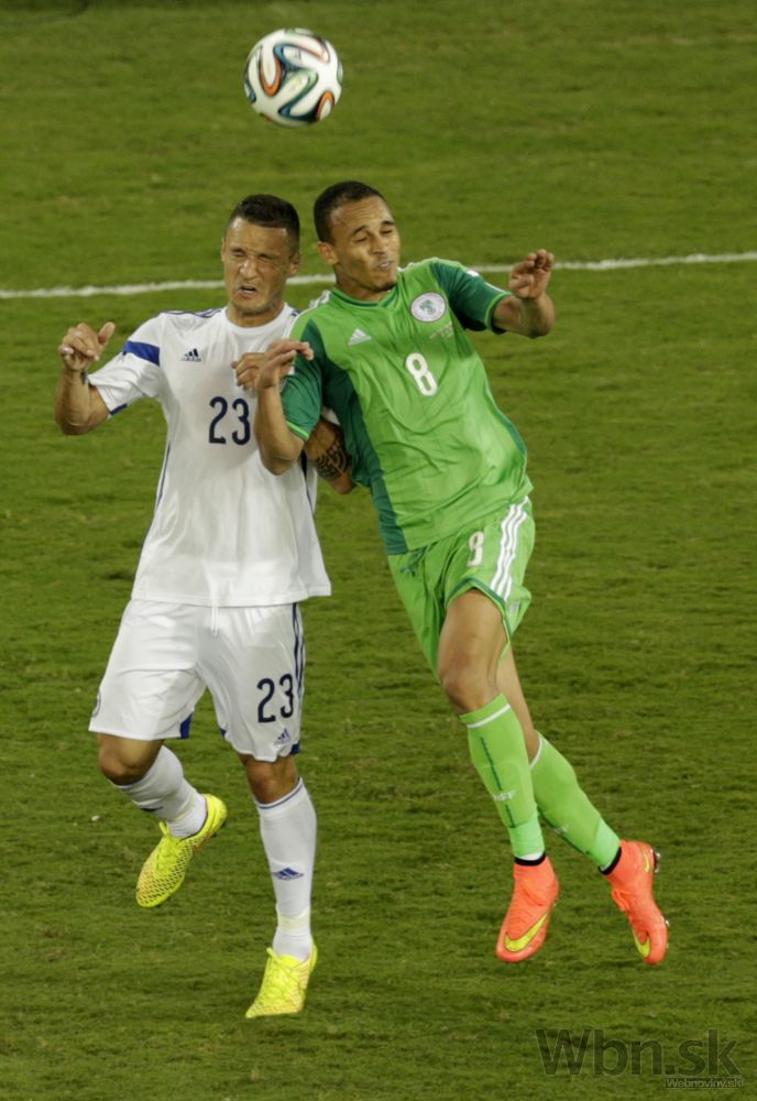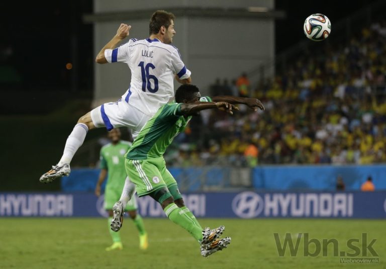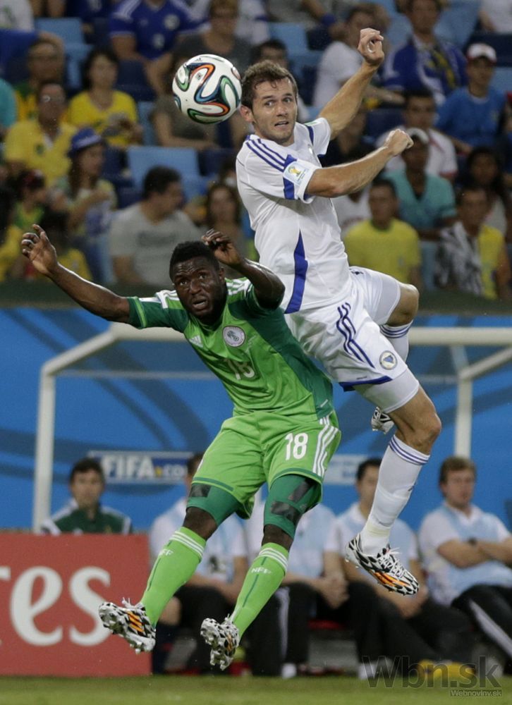 Futbalista Bosny a Hercegoviny Senad Lulic v súboji s nigérijským futbalistom počas sobotňajšieho zápasu F-skupiny na svetovom šampionáte v Brazílii. Foto: SITA/AP