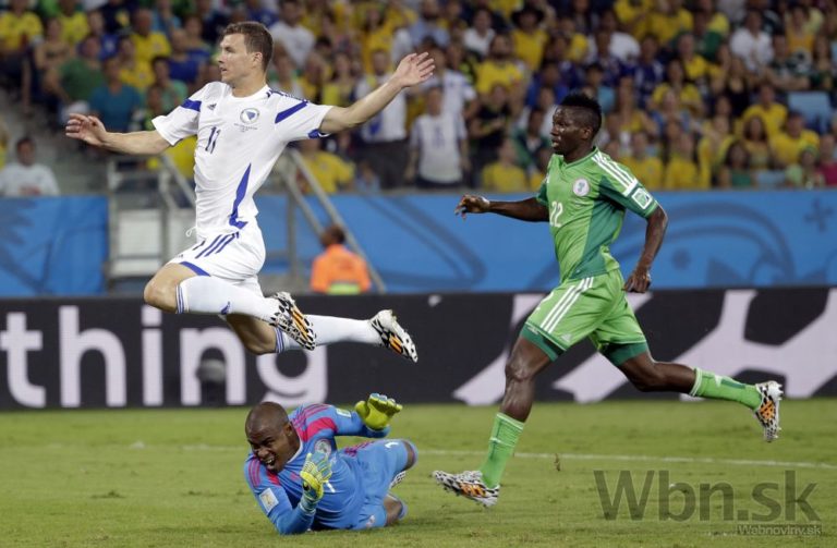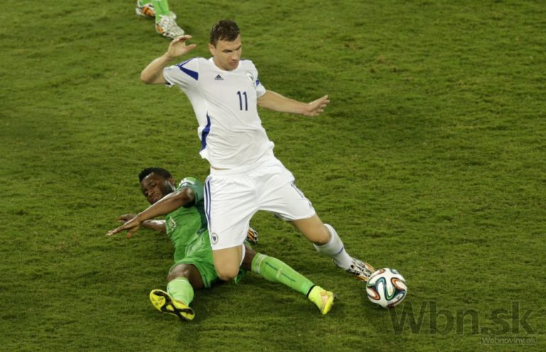 Futbalista Bosny a Hercegoviny Edin Džeko v súboji s nigérijskými futbalistami počas sobotňajšieho zápasu F-skupiny na svetovom šampionáte v Brazílii. Foto: SITA/AP