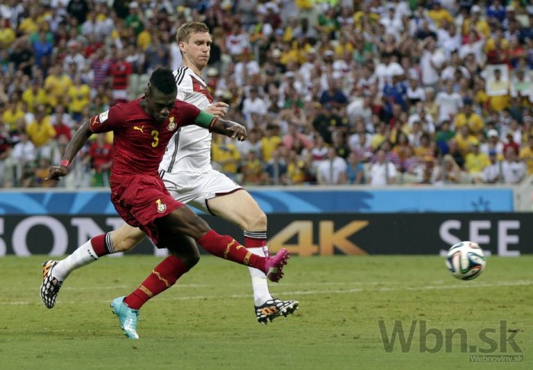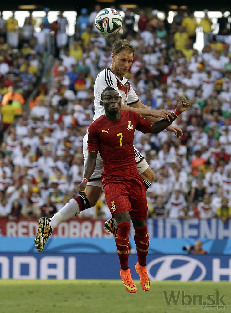 Ghanský futbalista Asamoah Gyan v súboji s Nemcom Matsom Hummelsom počas sobotňajšieho zápasu G-skupiny na svetovom šampionáte v Brazílii. Foto: SITA/AP