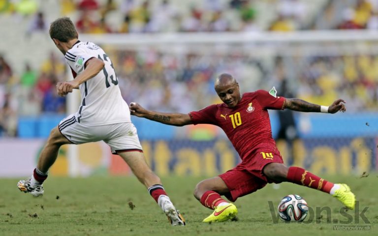 Ghanský futbalista Andre Ayew v súboji s Nemcom Thomasom Müllerom počas sobotňajšieho zápasu G-skupiny na svetovom šampionáte v Brazílii. Foto: SITA/AP