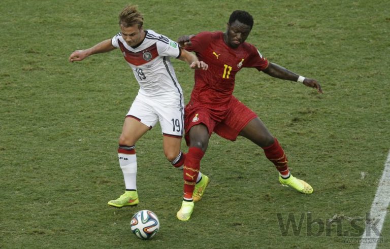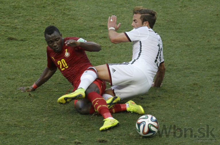 Ghanský futbalista Kwadwo Asamoah v súboji s Nemcom Mariom Götzem počas sobotňajšieho zápasu G-skupiny na svetovom šampionáte v Brazílii. Foto: SITA/AP
