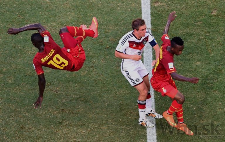 Nemec Philipp Lahm v súboji s ghanskými futbalistami počas sobotňajšieho zápasu G-skupiny na svetovom šampionáte v Brazílii. Foto: SITA/AP