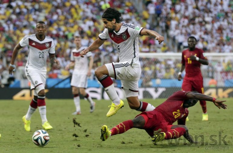 Ghanský futbalista Kwadwo Asamoah v súboji s Nemcom Samim Khedirom počas sobotňajšieho zápasu G-skupiny na svetovom šampionáte v Brazílii. Foto: SITA/AP