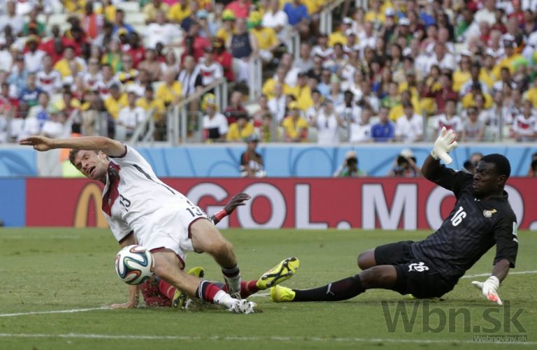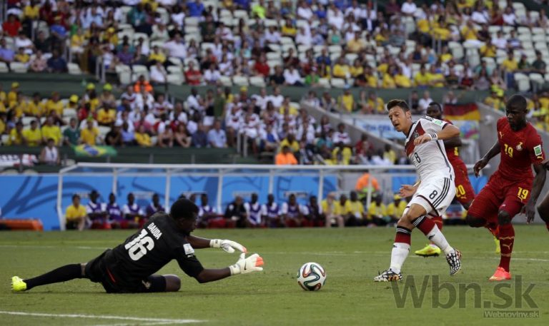 Ghanský brankár Fatawu Dauda vyráža loptu po strele Nemca Mesuta Özila počas sobotňajšieho zápasu G-skupiny na svetovom šampionáte v Brazílii. Foto: SITA/AP