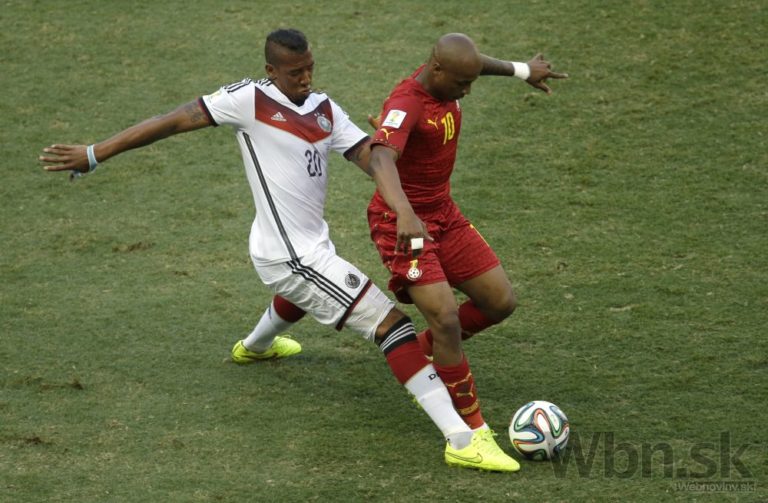 Ghanský futbalisti Andre Ayew v súboji s Nemcom Jerome Boatengom počas sobotňajšieho zápasu G-skupiny na svetovom šampionáte v Brazílii. Foto: SITA/AP