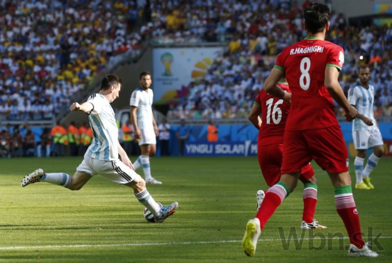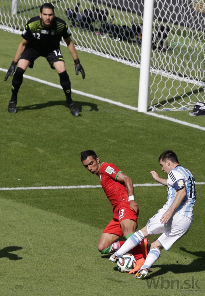 Hviezdny Argentínčan Lionel Messi streľa víťazný gól svojho tímu do siete Iránu počas sobotňajšieho zápasu F-skupiny na svetovom šampionáte v Brazílii. Foto: SITA/AP