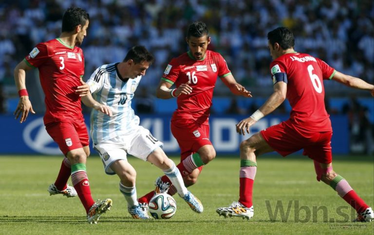 Hviezdny Argentínčan Lionel Messi v obkľúčení iránskych futbalistov počas sobotňajšieho zápasu F-skupiny na svetovom šampionáte v Brazílii. Foto: SITA/AP