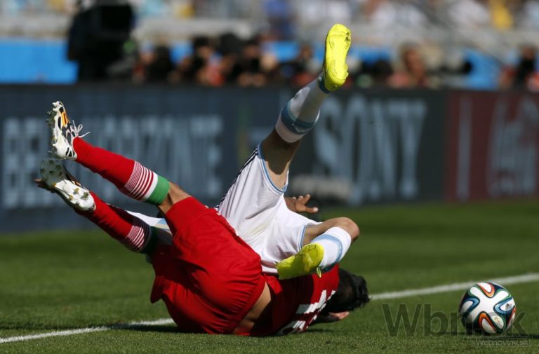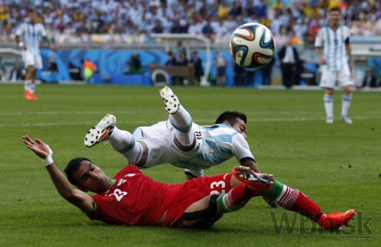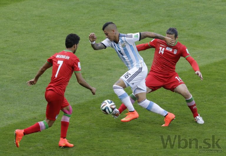 Argentínčan Marcos Rojo v súboji s Iránskymi futbalistami počas sobotňajšieho zápasu F-skupiny na svetovom šampionáte v Brazílii. Foto: SITA/AP