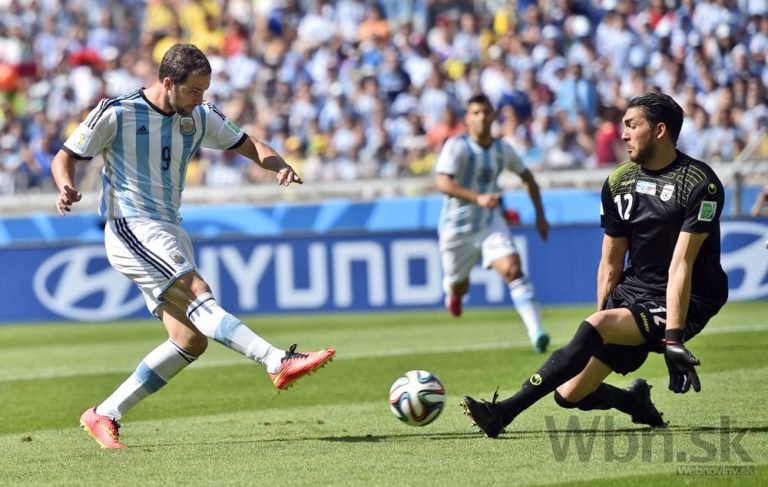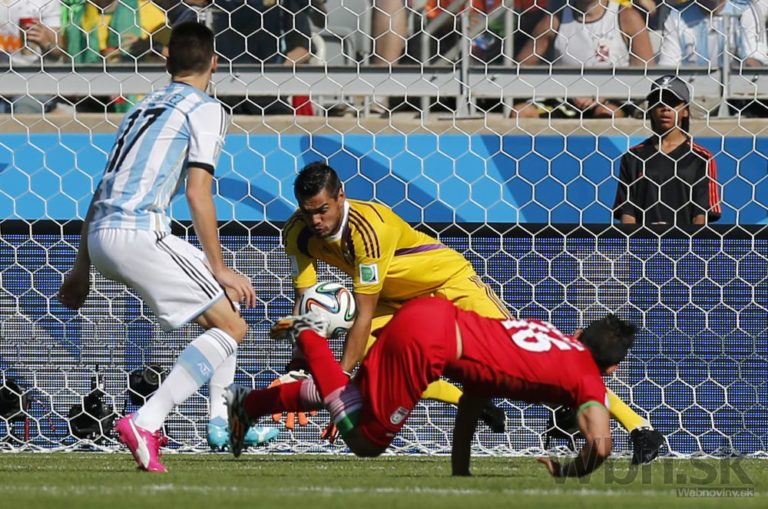 Argentínsky útočník Gonzalo Higuain sa snaží prekonať iránskeho brankára Alireza Haghigho počas sobotňajšieho zápasu F-skupiny na svetovom šampionáte v Brazílii. Foto: SITA/AP