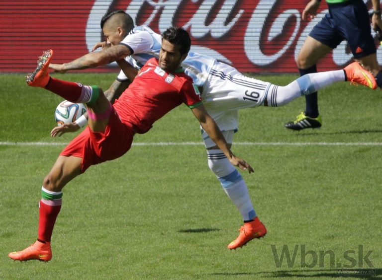 Iránsky futbalista Reza Ghoochannejhad v súboji s Argentínčanom Javierom Mascheranom počas sobotňajšieho zápasu F-skupiny na svetovom šampionáte v Brazílii. Foto: SITA/AP
